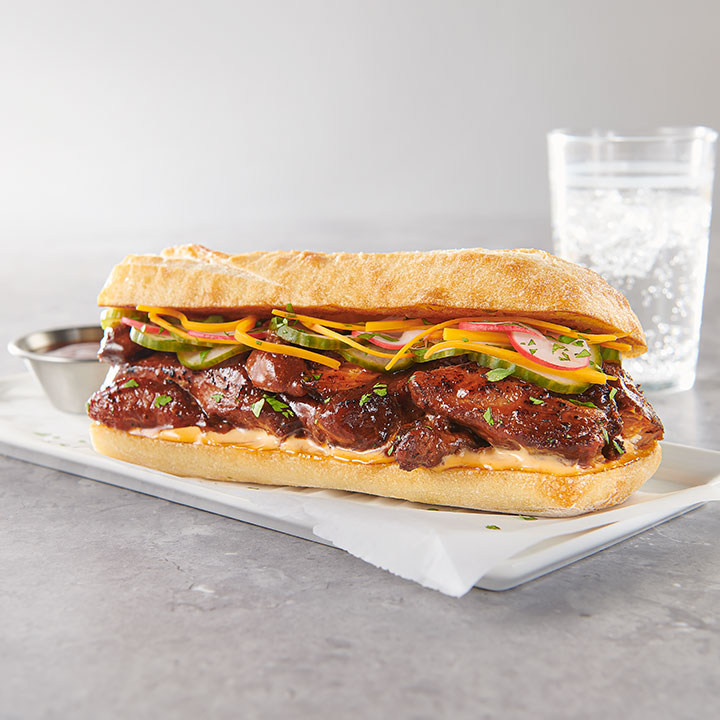 Crispy slow roasted Charter Reserve® Pork Burnt Ends served on a French baguette with sliced cucumbers, pickled carrots and pickled red onions, jalapenos, cilantro and a Sriracha Chili lime mayo.